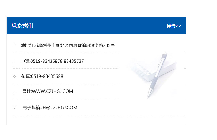 地址:常州市新北區友邦商務大廈1幢16、17層  電話:0519-85101652  傳真:0519-85112595  郵編:213022  網址:www_cz-jiayue_cn.jeldr.com  郵箱:xiajifengaa@163.com
